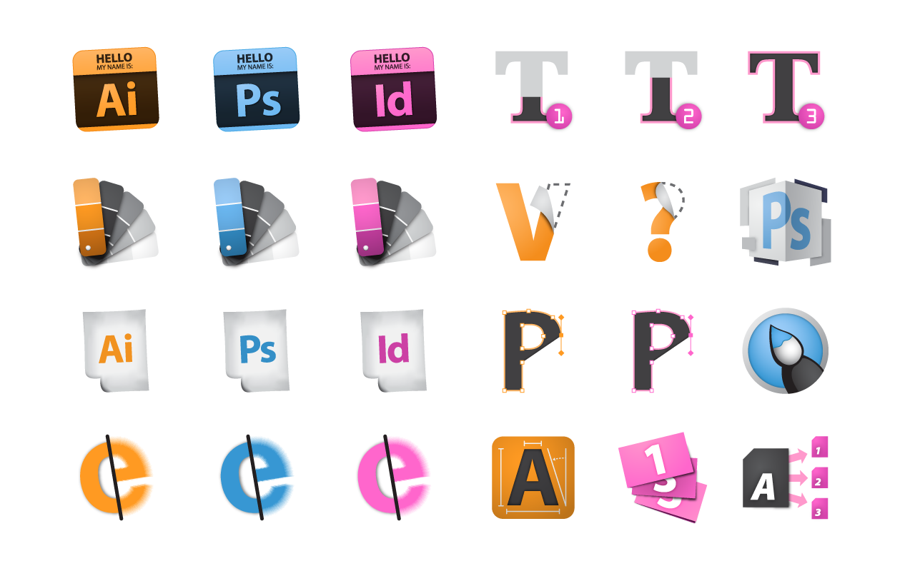 A series of icons representing basic skills in Adobe apps, used as a part of computer design curriculum for post-secondary students.